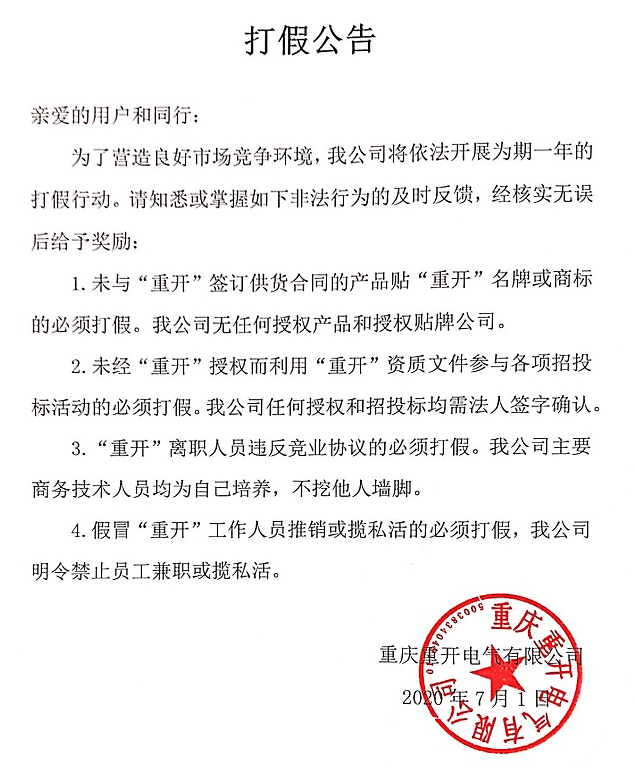 1.未與“重開”簽訂供貨合同的產(chǎn)品貼“重開”名牌或商標(biāo)的必須打假。我公司無任何授權(quán)產(chǎn)品和授權(quán)貼牌公司。